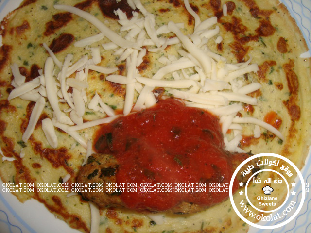 - نرش كمية مناسبة من جبن الموزاريلا المبشور فوق الكريب المرصوص بالقالب ثم نفرغ عليه صلصة الطماطم المتبقية. ندخلها للفرن على نار هادئة الى ان يذوب الجبن.