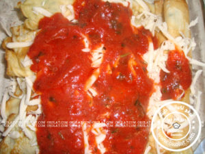 - نأخد كريب نبسط الطماطم داخله، نضع قضيبا من اللحم المفروم، نرش فوقة القليل من الجبة المبشورة ونلفها.. نستمر بنفس الطريقة إلى أن نتم الكريب كله ثم نرصه في وعاء الفرن.
