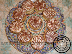 - نضع الشوكولاته في قمع من ورق الزبدة ونرسم خطوط دائرية ثم نجرها بقطعة خشبية رقيقة لنحصل على زخرفة .