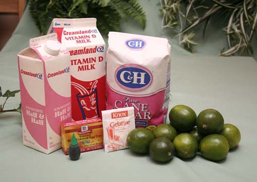 - نضيف عصير الليمون وملعقة قشرته الى الحليب ثم نضيف 3 كوب من “الهاف اند هالف” و قطرات اللون الاخضر إلى الخليط.