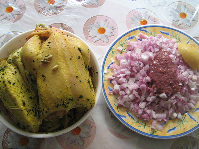 - يُخلط البصل والثوم والتوابل والبقدونس والكزبرة والملح والفلفل مع الدعك باليد جيداً ليتجانس الخليط. ثم يُدعك الدجاج بنصف خلطة البصل.