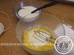 • نضع أصفر البيض في وعاء، نضيف السكر، الفانيلا أو قشرة الليمون ونخفق الكل جيدا. ثم نضيف النشا ونخلط .