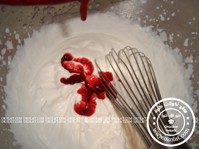 • عندما يبرد خليط الفرمبواز نضيفه على الكريمه و نخلط.. ثم نصب الخليط في قالب دائري و ندخله لثلاجة ليتماسك و يبرد.